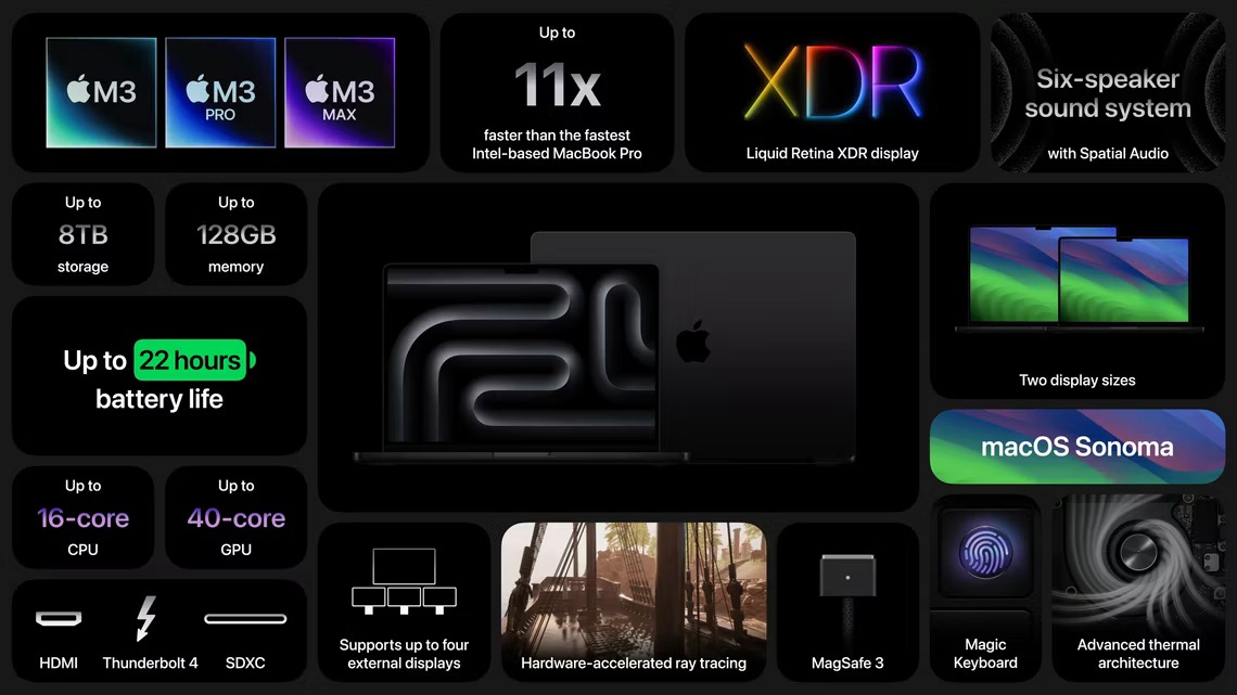 Главной движущей силой MacBook Pro 16 является обновлённый чип Apple M3 Max. Он сочетает в себе 14 ядер центрального процессора и 30-ядерный графический ускоритель. Благодаря этому ноутбук легко справляется с ресурсоемкими задачами, такими как современные игры с детализированной графикой, видеомонтаж и 3D-моделирование, а также с обычными рабочими и учебными задачами.